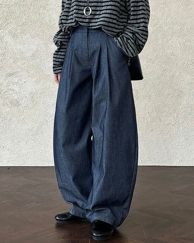 M : 着丈 102cm、ウエスト 66cm、裾幅 50cm L : 着丈 103cm、ウエスト 70cm、裾幅 52cm 着用モデル 165cm、Mサイズ 69%コットン、29%ポリエステル、2%ポリウレタン カーブのかかったシルエットがきれいで着丈もしっかり。 ハリのあるスラックスとデニムの間のようなパンツです。 万能に使えます。